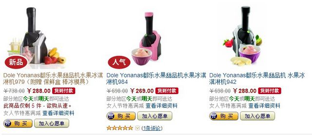亚马逊中国目前3款都乐冰淇淋机979、984、942都在特价中,可参加女人节满减优惠。其中Dole Yonanas 979特价288元,并赠送保鲜盒和棒冰模具。下单两台用码“B499MORE”,结账396元,合198元一台。和小伙伴一起凑单吧,小编在此默默流泪,当初500+入手的啊。。