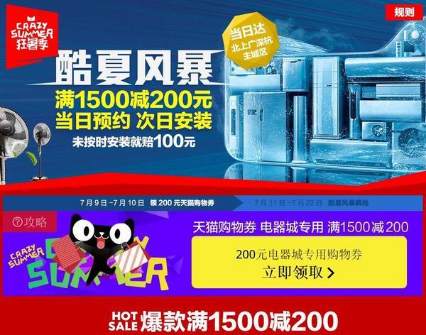 天猫电器城酷夏风暴大促来袭~大波空调、冰箱、风扇好价商品供网友选择~本次天猫电器城大促,从9日0点开始,一直延续到22日晚24点,9日到10日预热,期间满1500减200大额天猫电器城专用购物券开放抽取,广大剑客们可以抽券防身,11日至22日正式大促开始,各种空调、冰箱、大小家电、3C数码好价商品轮番上阵,小编整理了几个会场,各位剑客可以静待出手!